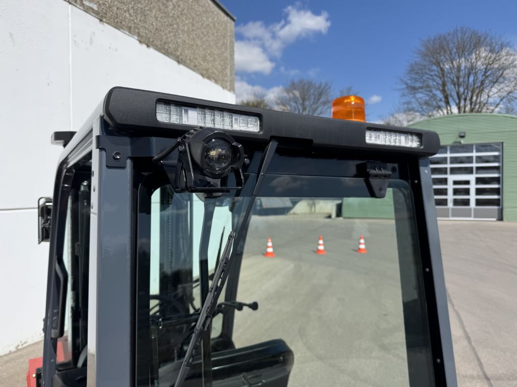Details: OSR Komfortsitz, Heckscheibe, 90° Neigung auf Knopfdruck, LED Frontkombileuchte, LED Rückkombileuchte, Beleuchtungsanlage, Weitwinkelspiegel, Getriebeumschaltschutz, 4. Hydraulik Steuerkreis, SAS-System (System für aktive Stabilität) -Hubgerüststeuerung -Lenksynchronisation - Lenkachsenstabilisator, Multifunktionsdisplay -Einstellung der max. Fahrgeschwindigkeit -Anzeige des Lastgewichts -Neigewinkelanzeige -Energieverbrauchsanzeige